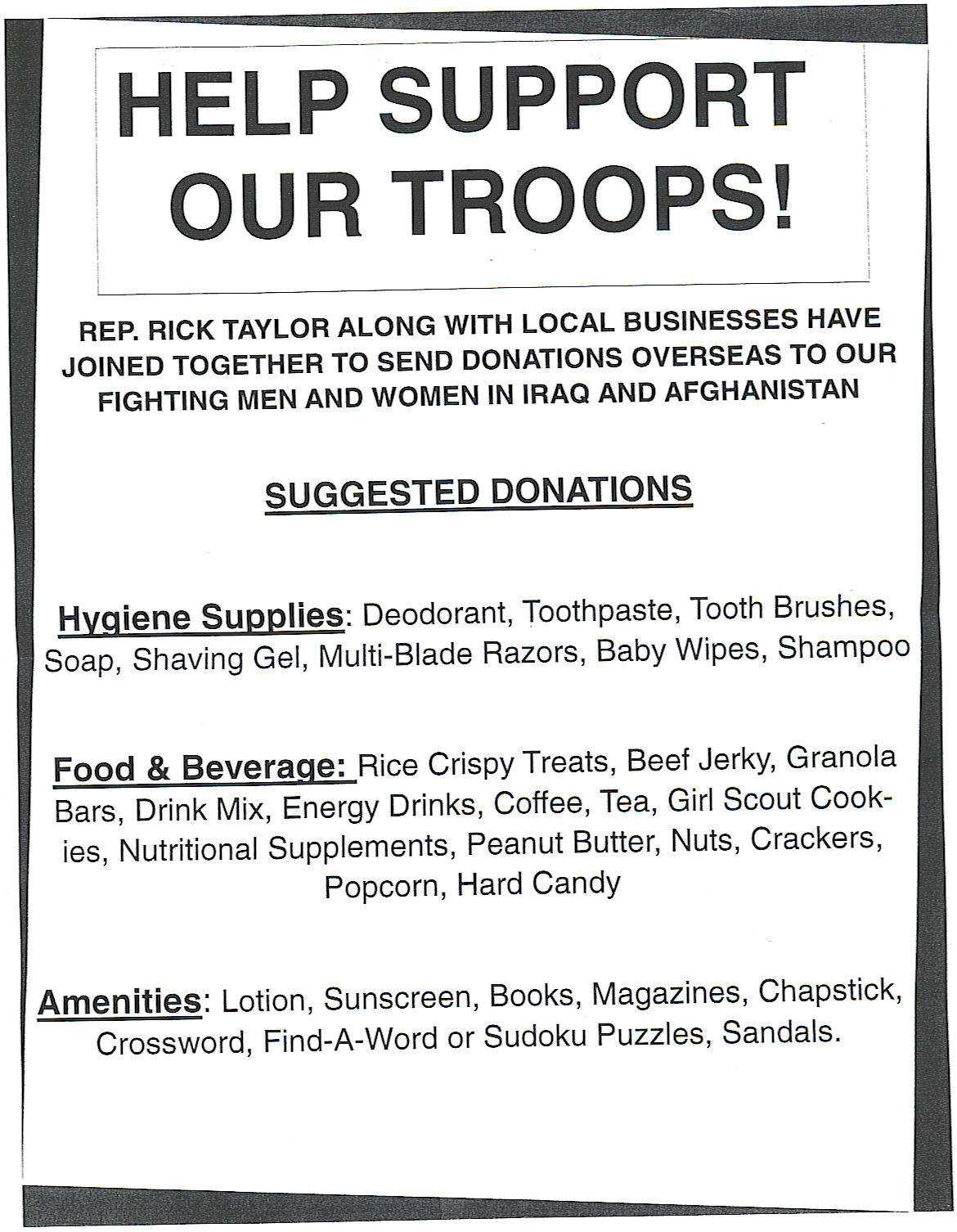 The A’s Society is proud to join PA 151st district State Representative Rick Taylor in his efforts to support our troops. Suggested donations as listed below can be dropped off or mailed to the A’s Society Hatboro facility 6 North York Road, The Days Inn Easton Road, Horsham, Pa, or the Harleysville Bank 2 North York Road, Hatboro, PA.