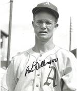 Dillinger attended the University of Idaho on a football scholarship and was known for his great speed. He once raced Jesse Owens and lost but Dillinger wore a baseball uniform and Owens a track suit. He was signed by the St.Louis Browns but wartime service delayed his career. He came to the A’s in 1950 but his speed and batting did not overcome poor fielding and throwing and he was sold to the Pirates at quite a loss. He also played for the White Sox. The A’s infield was happy to later reacquire Hank Majeski.