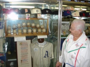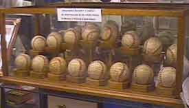 Doris Chism is shown here viewing the 16 autographed baseballs that have been on loan to the Society is November 1998 when her late husband Ray brought them in and became the first item in the Society’s Museum. There is quite a story behind these baseballs.