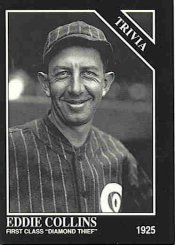 Collins played regularly at second base for the White Sox until the age of 39 in 1926. Released by the Sox as managerat the end of 1926, Eddie Collins returned to Connie Mack and his White Elephant roots in 1927 where he played back up second base, coached and hit .338. His World Series experience was expanded in 1929, 1930 and 1931 as third base coach of the great Philadelphia Athletics team of this era.