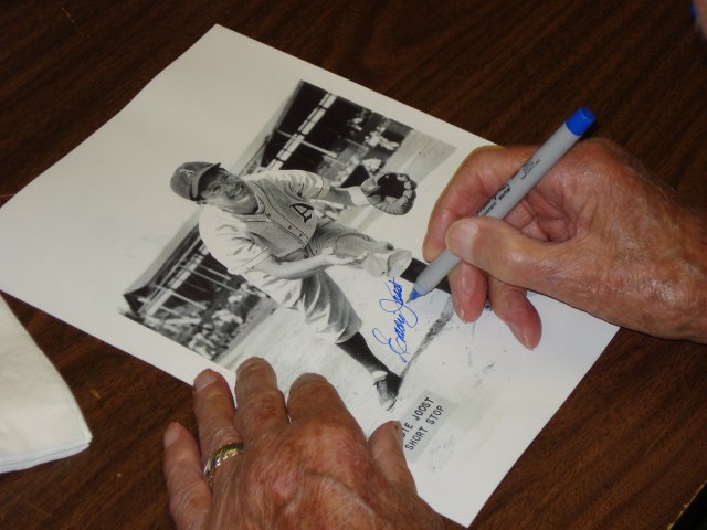 Joost has the distinction of still holding a Major League Baseball record. Playing shortstop with the A’s in 1949, he and the doubleplay combination of Pete Suder at second base and Ferris Fain at first base turned 217 doubleplays, a number that still stands today as a single-season record and one that Joost and A’s Society members hope gets formal recognition from the baseball Hall of Fame in Cooperstown, N.Y.