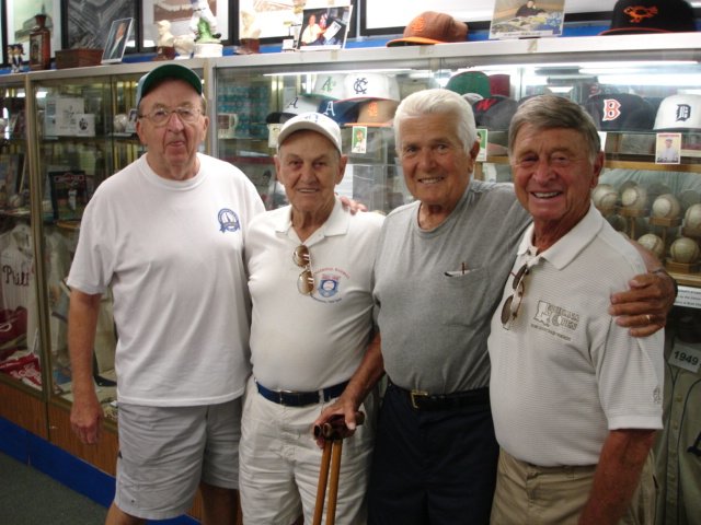 Thursday July 31 was a special day in the Society’s Museum when 2 members Pat Ramone & Stanley Bradley brought in two former Major League pitchers. Shown in this photo left to right Society member Stanley Bradley, Pat Ramone, George Estock, Bobby Shantz. Ramone & Bradley are part of the Delaware Sports Hall of Fame located at the Wilmington Blue Rocks Ball Park in Wilmington Delaware.