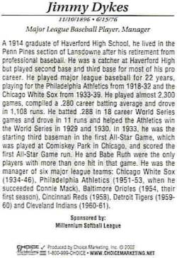 Jimmy Dykes place in Athletics history is well established. He played more games, had more at bats and hit more doubles than any Philadelphia Athletics player. In the 105 year franchise history, he is 3rd in games and at bats, 7th in runs, 4th in hits, 8th in RBIs and no player has more doubles than Jimmy Dykes. When Jimmy Dykes died 23 years ago, Philadelphia not only lost a home town boy who did well, they lost a legend.