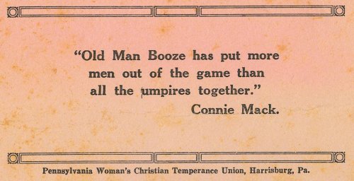 The Temperance Movement—dedicated to abstinence from the use of intoxicating drink—pushed for adoption of the Eighteenth Amendment. The handbill accompanying this story that contains the quotation from Connie Mack about “Old Man Booze” calling out more players than all the umpires put together was distributed by the Pennsylvania Women’s Christian Temperance Union in Harrisburg, Pa. As noted, Mack’s refusal to imbibe, disapproval of players drinking excessively, and celebrity status as a successful Major League manager made him a most quotable figure for the Temperance Movement to use in publicizing its cause. The handbill probably dates from the mid-to-late teens.