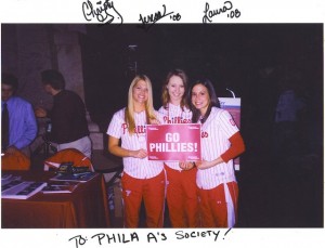A’s Society volunteer Michael Fesnak has developed a nice relationship with the Phillies Ball Girls that began at the start of the season. Fesnak mailed each a card to sign and the result is this very unique display in the Museum that draws all kinds of nice comments from our visitors. The following letter was directed to Fesnak from the ball Girls: