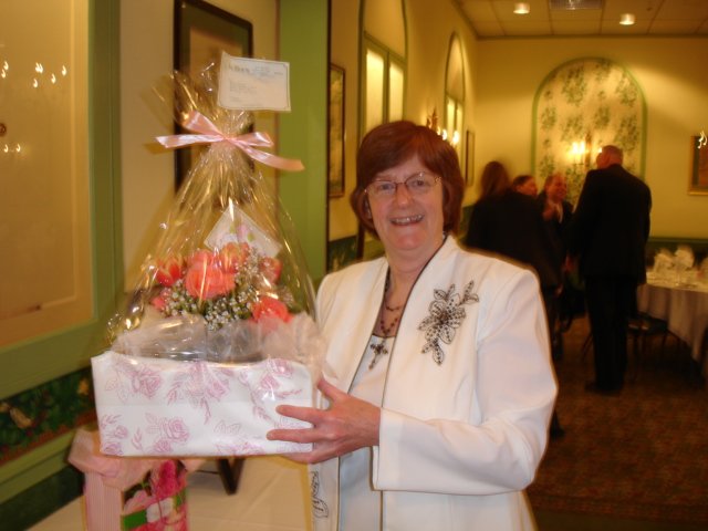 Ruth’s Daughter Alice Cunningham, Mr. Mack’s grandaughter, shows off the one of the flower displays Ruth received during her special luncheon at Williamson’s Restaurant in Horsham, Pa .