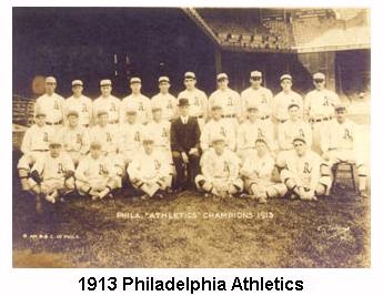 The 1913 pennant race was not much of a race after all. The Athletics squelched any suspense in the American League chase by moving into first place in late April and never relinquishing the position. A 15-game winning streak during the season helped the Athletics maintain the lead. The “$100,000 infield” performed superbly, with McInnis, Collins, and Baker all hitting over .300, and Baker leading the league in home runs (12) and RBIs (117). The three regular outfielders all hit respectably—Murphy at .295, Oldring at .283, and Walsh at .254. As a reserve outfielder, Strunk batted a commendable .305. Leading the pitching staff was Bender with 21 wins, followed by Plank (18), Brown (17), Houck (14), Bush (14), and Shawkey (8). Pennock won only two games for the Athletics in 1913. His Hall of Fame pitching career lay in the future with another team.