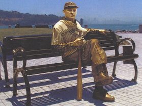 ‘TIBURON TERROR’: An artist’s rendering depicts a proposed statue of Sam Chapman on a bench at the Tiburon Ferry Plaza. Chapman, a Tiburon native, was a football and baseball stat at Tamalpais High School and the University of California at Berkley in the 1030s before an 11-year career in Major League Baseball.